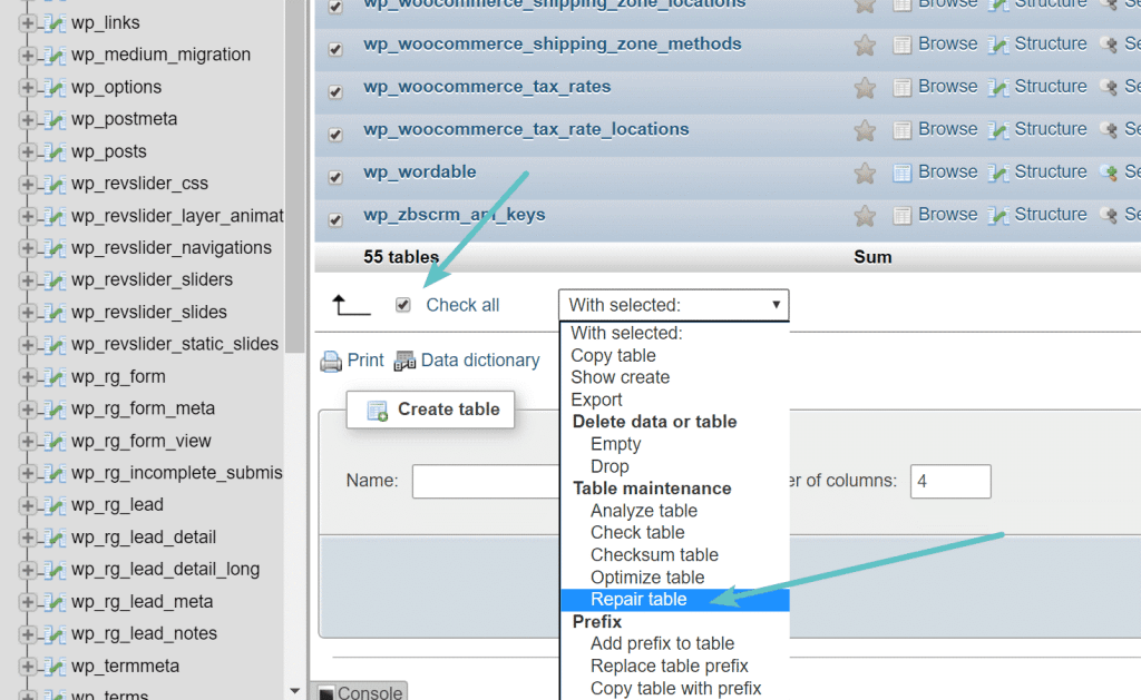Можете да оптимизирате и да поправите базата, като използвате и възможностите на PHPMyAdmin.