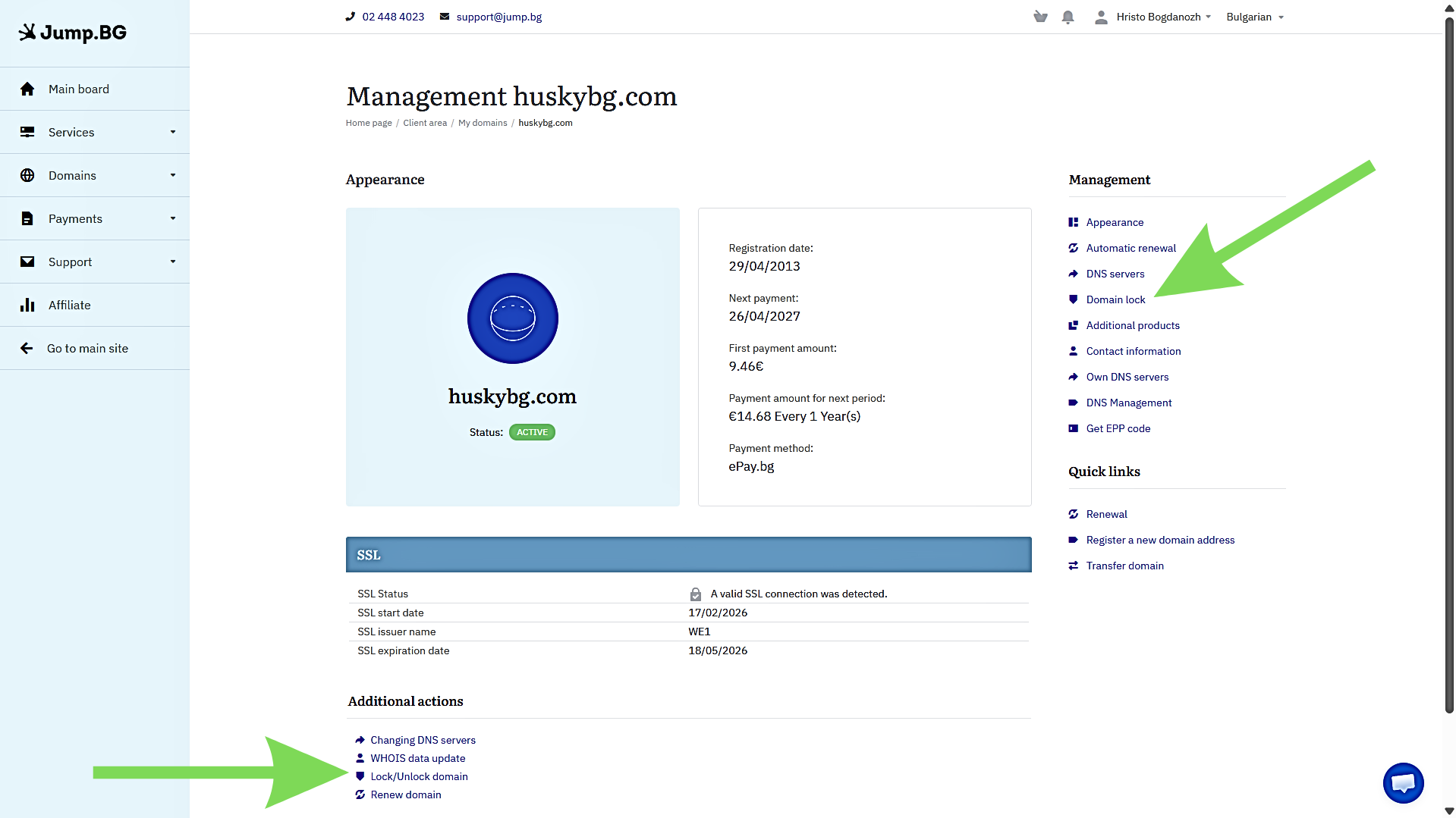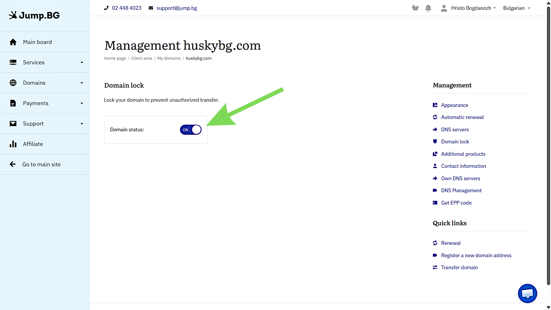 В Jump.bg функциите за сигурност на домейна, като заключването на домейна, са включени в стандартното управление, което дава на потребителите пряк контрол върху начина, по който домейните им се защитават в акаунта им.